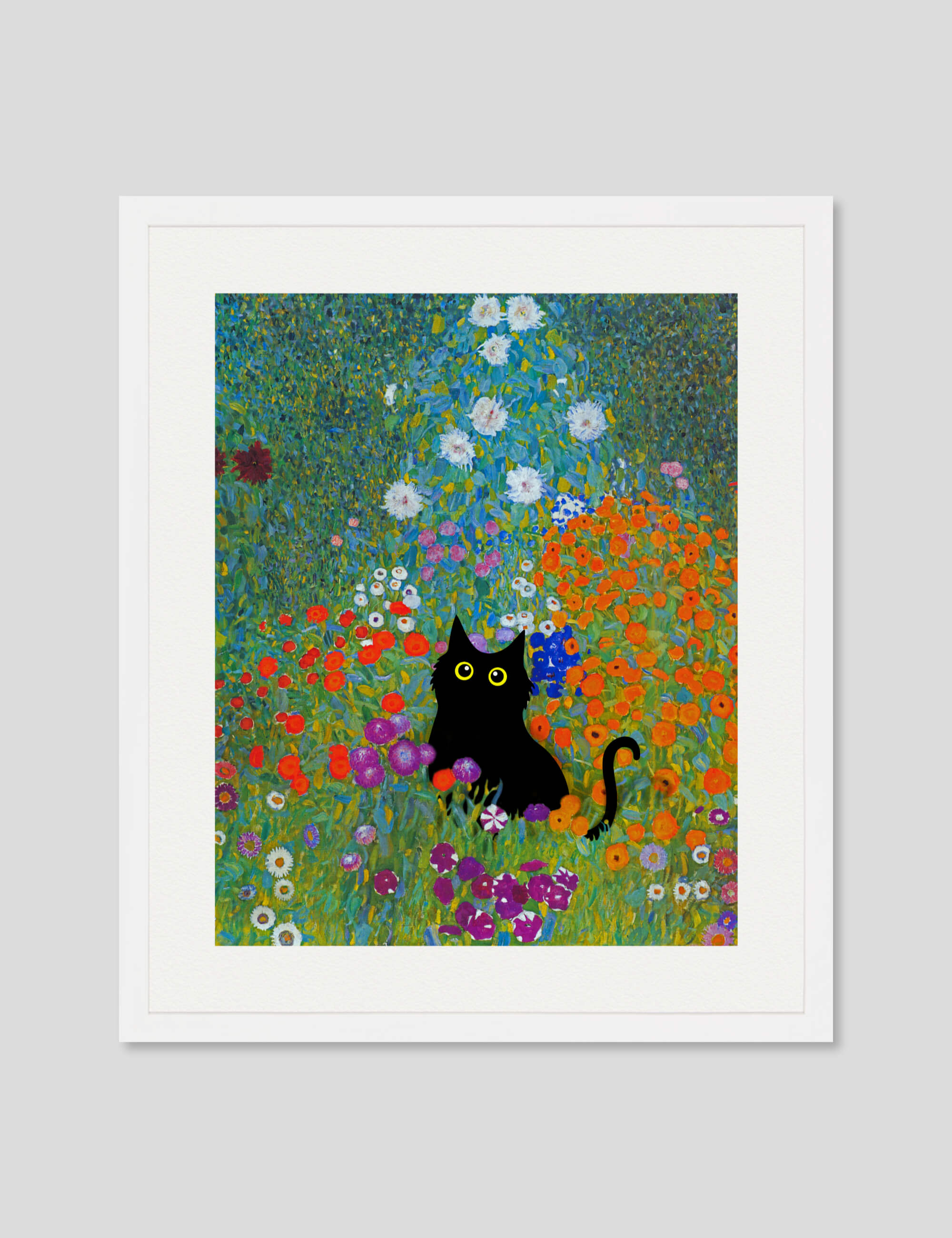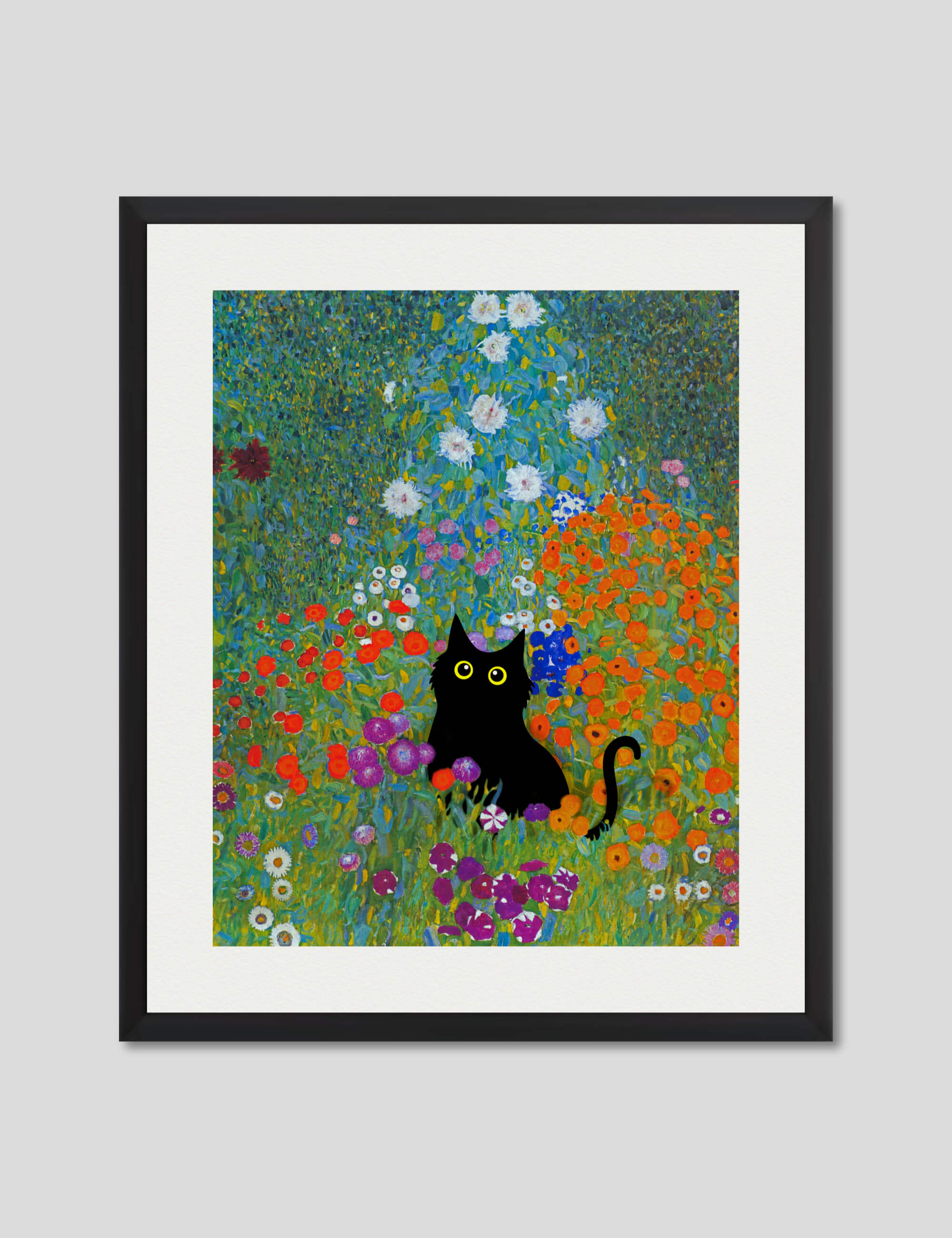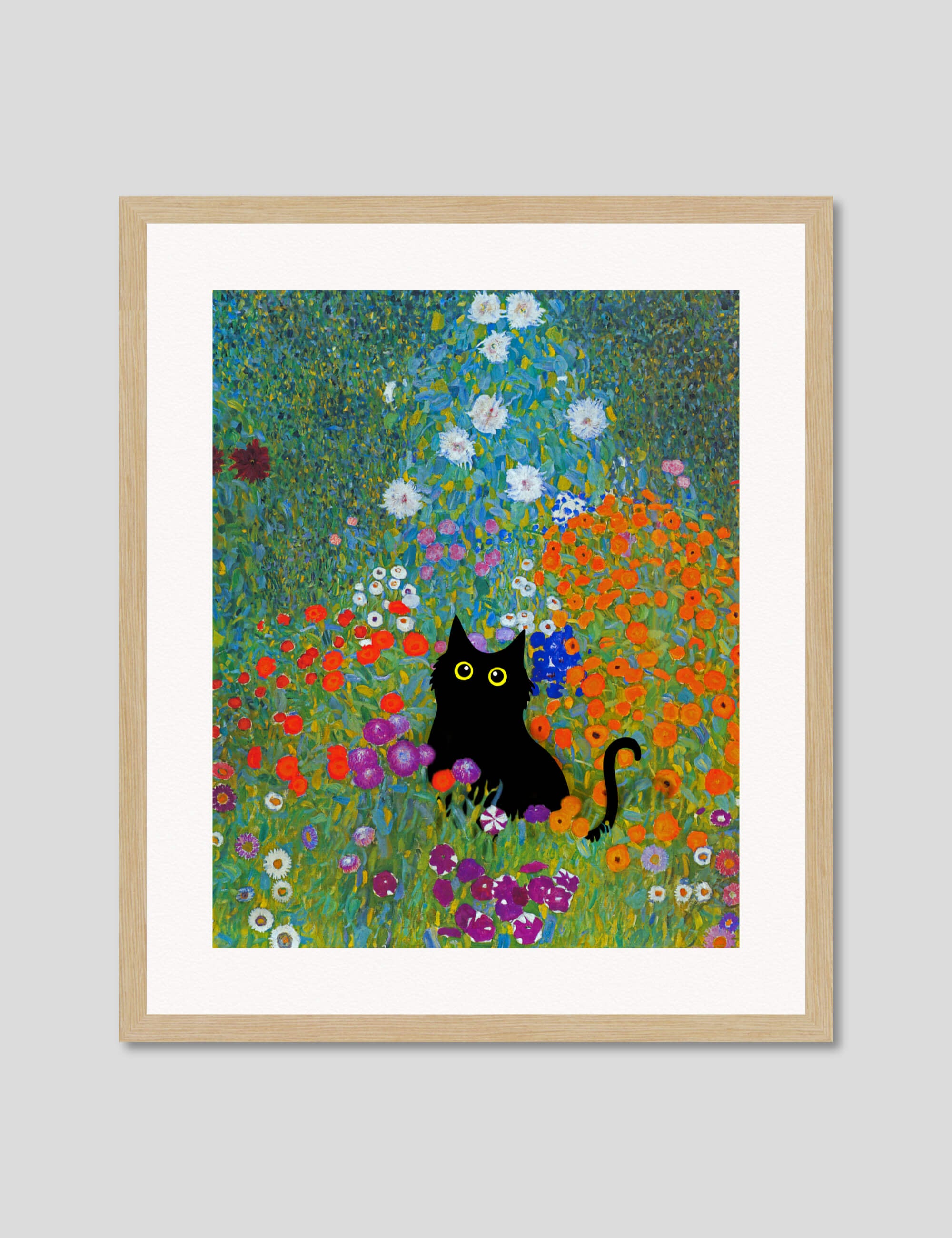 This playful and irreverent take on Gustav Klimt's iconic work Bauerngarten featuring the addition of a mischievous little black cat is perfect for adding a humorous light hearted tone to any setting. We love utilising it as a feature artwork in the bathroom or in a kids room. A delightful and fun artwork that is guaranteed to make you smile.