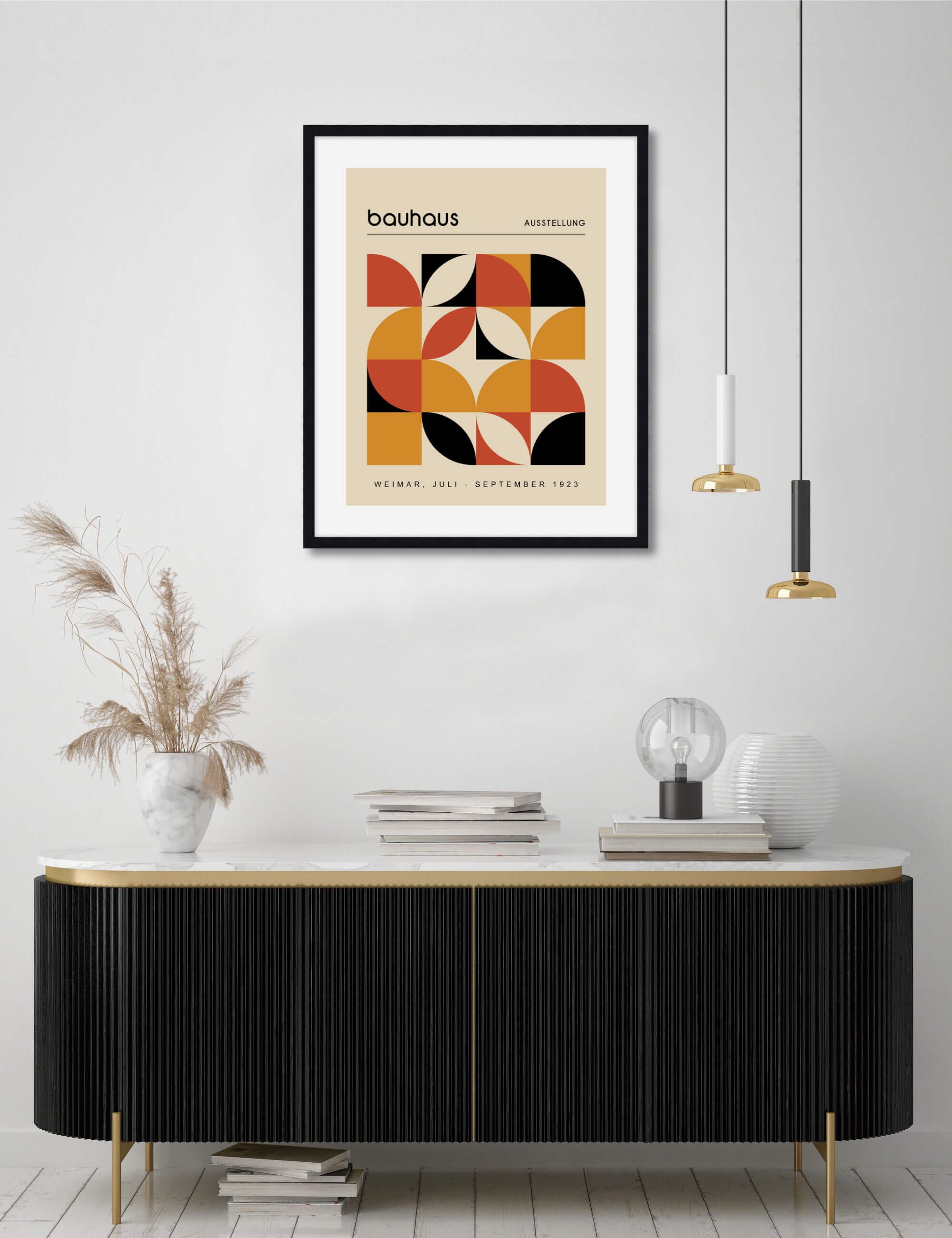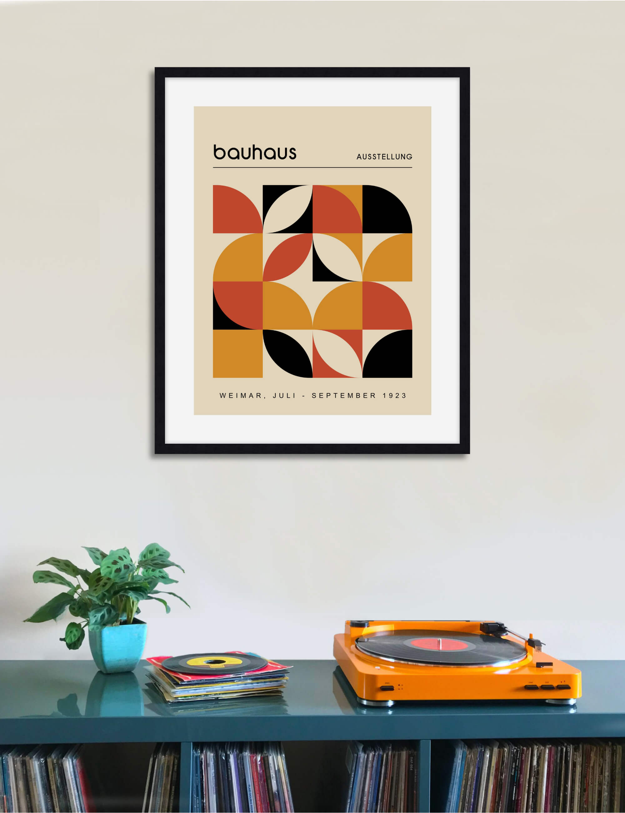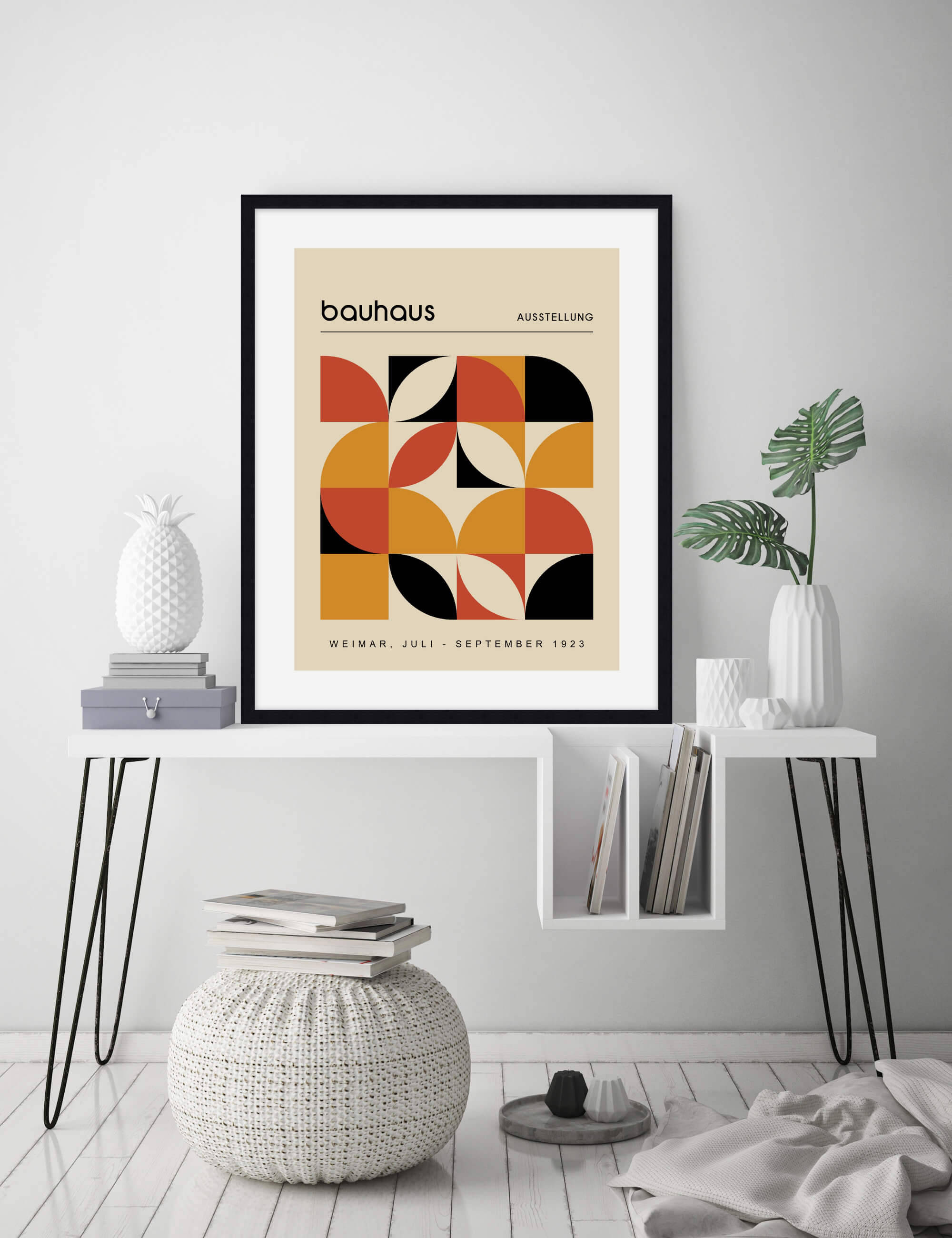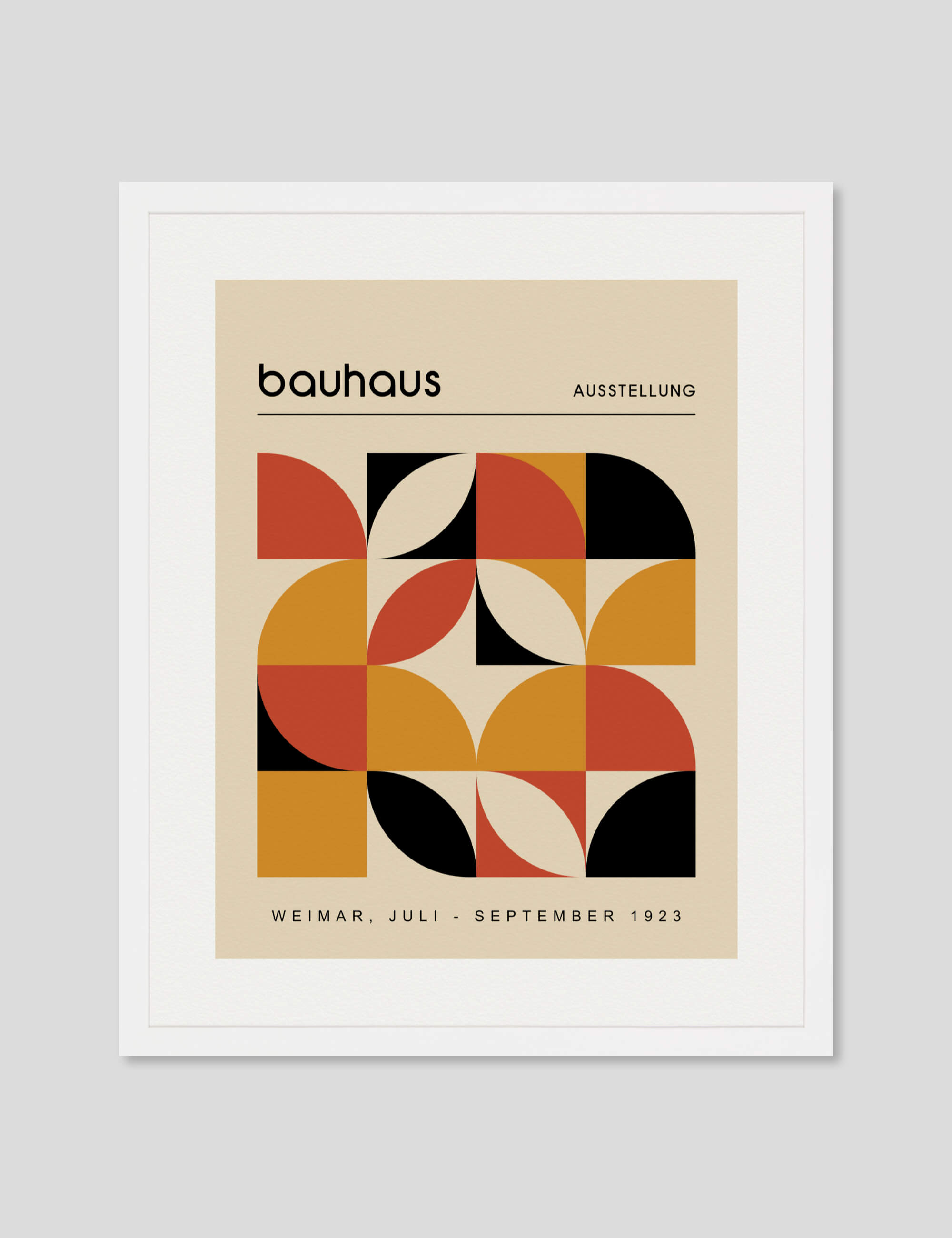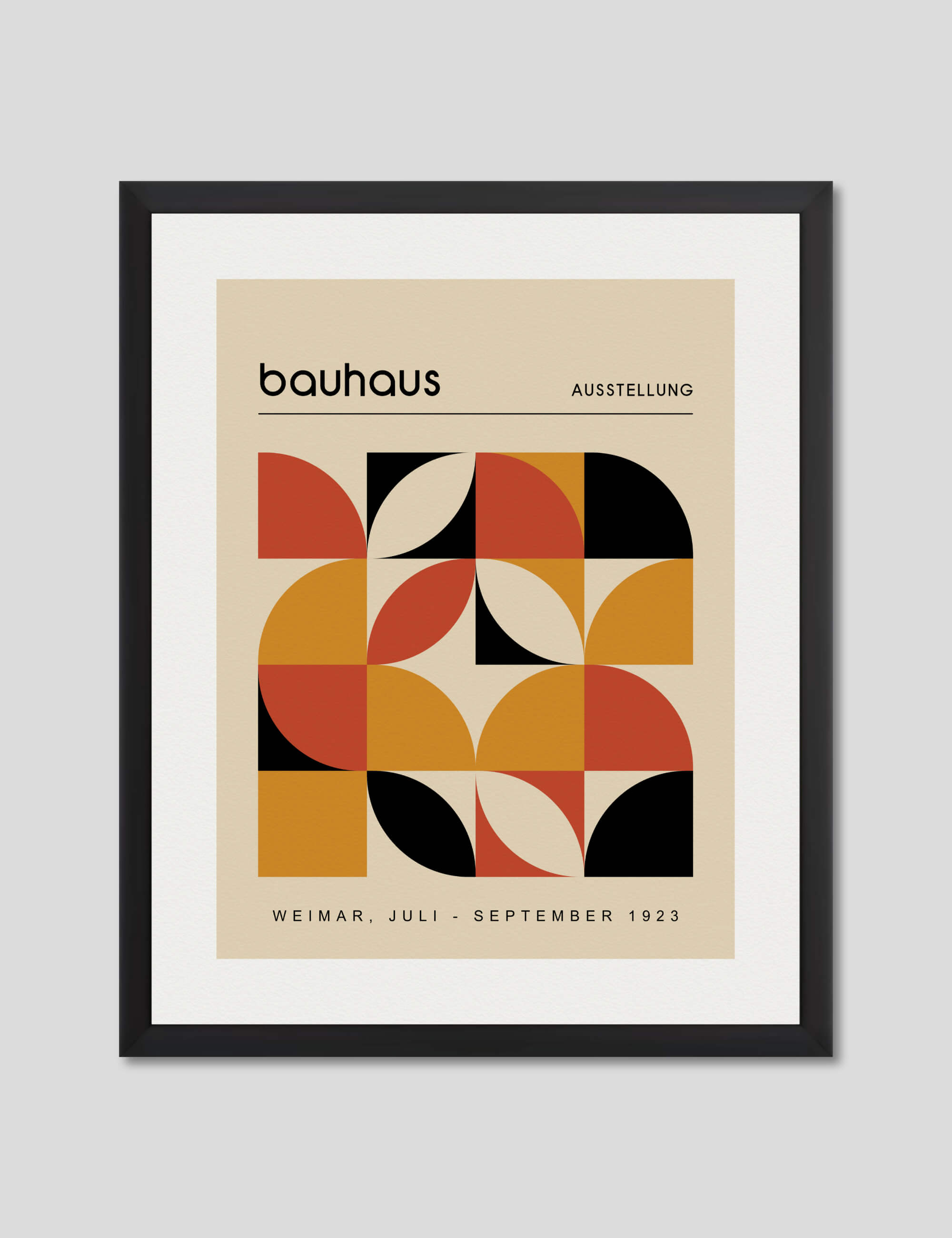 This premium quality giclee art print reproduction of a vintage advertising poster for the 1923 Bauhaus Ausstellung exhibition in Weimar has been produced on luxurious 100% cotton rag textured art paper using archival quality inks resulting in a superior print suitable for museum or gallery display. Featuring a stylish colour palette of orange, auburn, black and tan, paired with authentic Bauhaus typography and an intricate array of interlocking shapes this stylish artwork will make a stunning addition to both modern and vintage interiors.