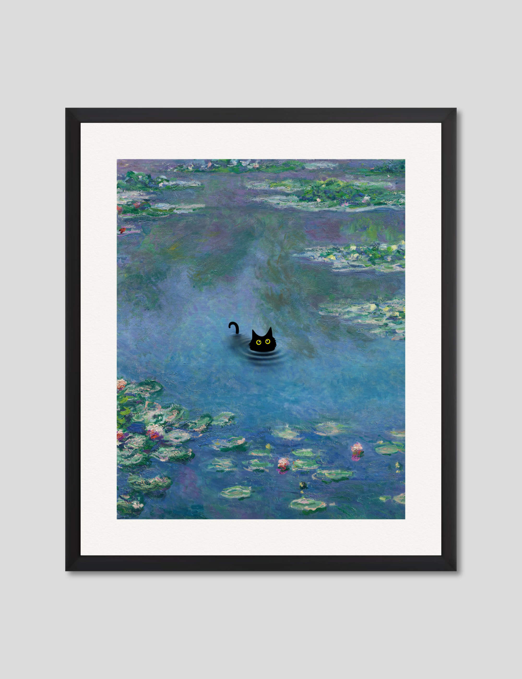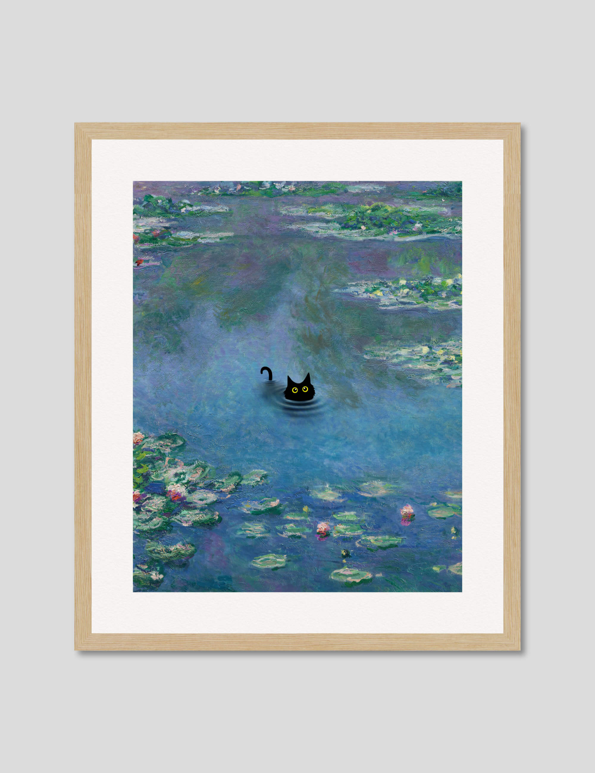 This playful and irreverent take on Claude Monet's iconic work The Water Lily Pond featuring the addition of a mischevious little black cat is perfect for adding a humorous light hearted tone to any setting. We love utilising it as a feature artwork in the bathroom or in a kids room. A delightful and fun artwork that is guaranteed to make you smile.