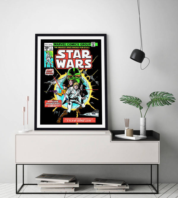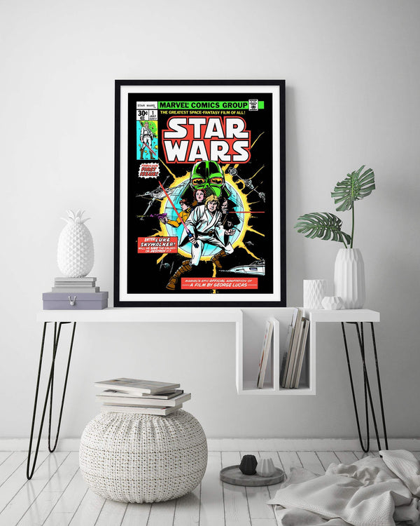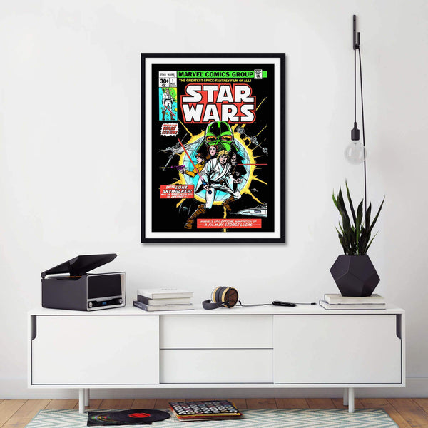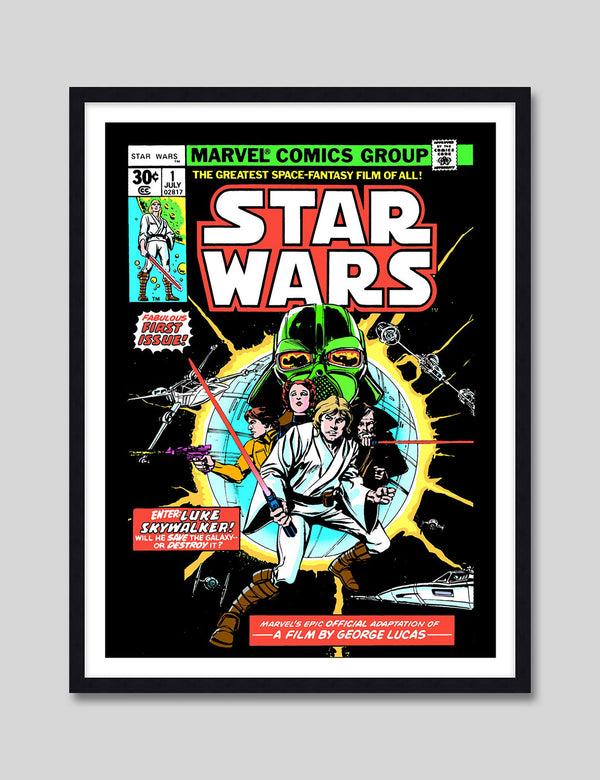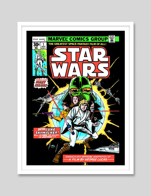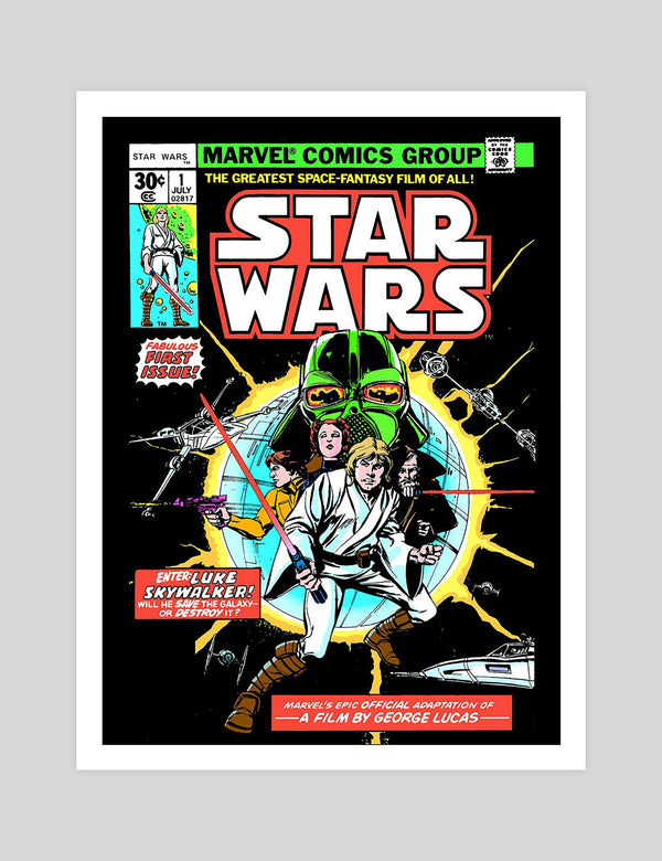 A long time ago, in a galaxy far, far away...We are very excited to present this officially licensed Marvel Comics cover art print of the 1977 Star Wars No.1 Comic. This stunning premium quality giclee art print is the perfect gift for any die hard Star Wars fan! It has been produced on luxurious 100% cotton rag textured art paper using archival quality inks resulting in a superior print suitable for museum or gallery display.