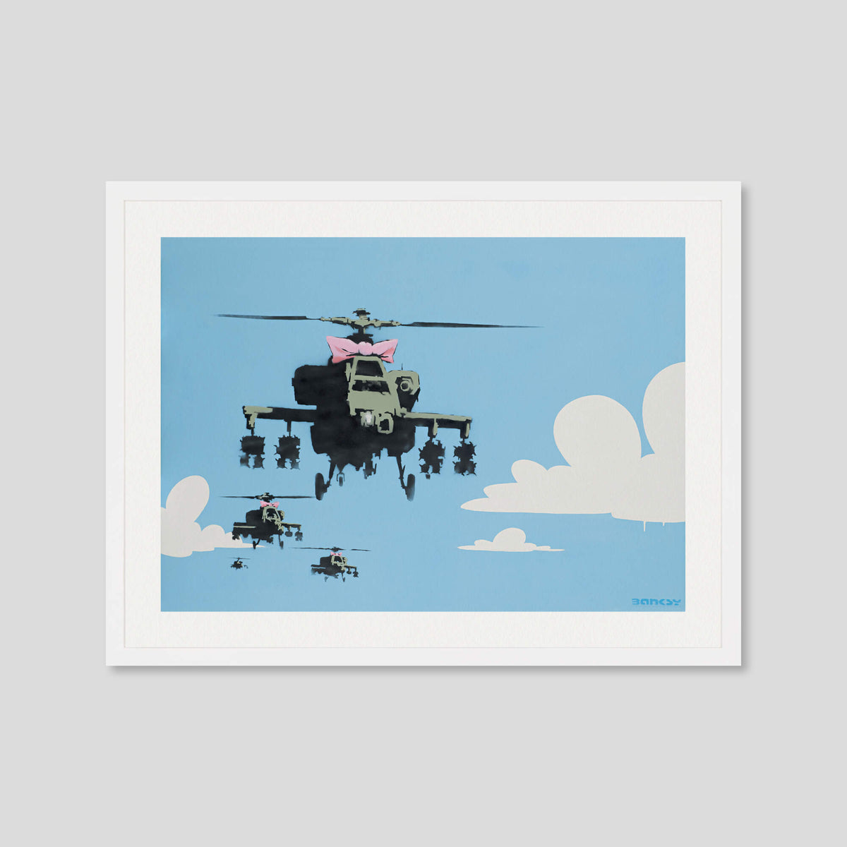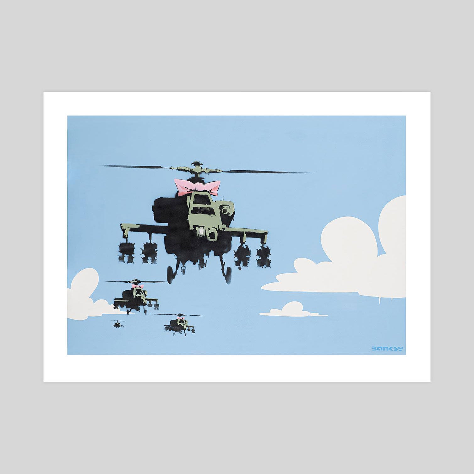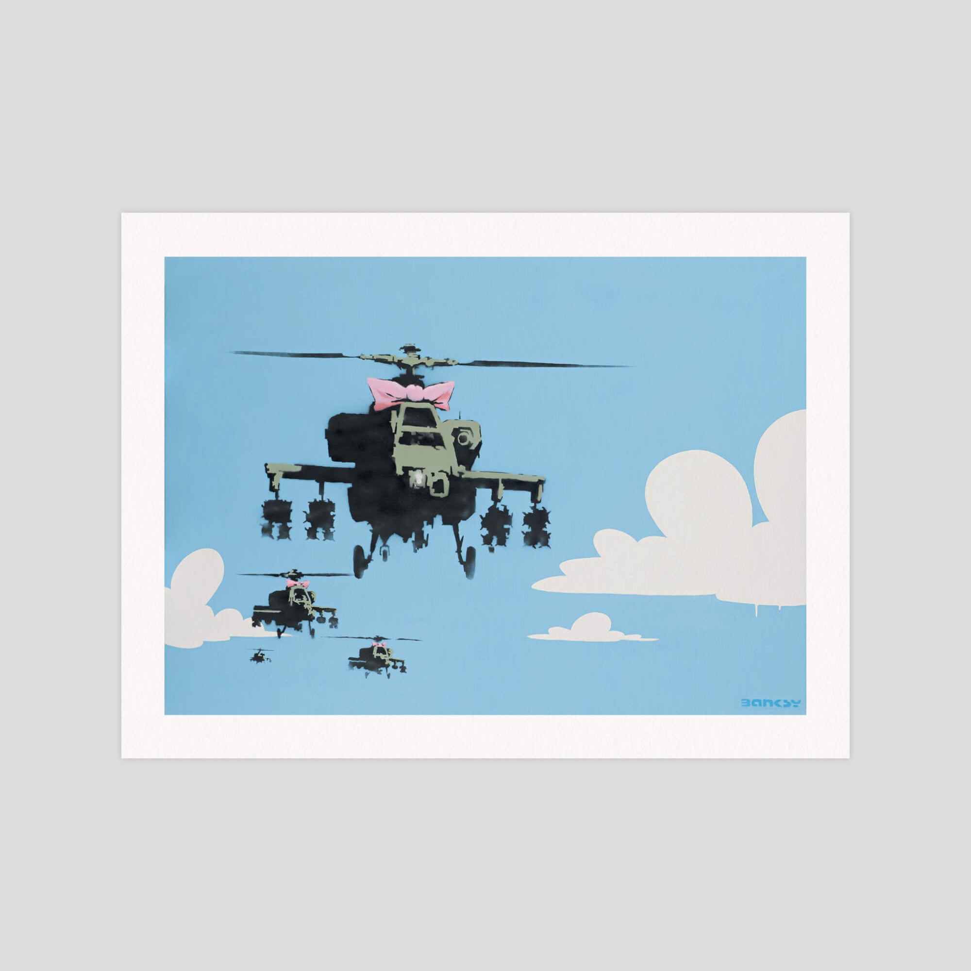 Happy Choppers depicts a squadron of armed military with a bright blue sky in the background. The sky, painted with white clouds, is quite simplistic and cartoon-like, almost reminiscent of The Simpsons opening credits. On the other hand, the helicopters are painted with more details insisting on their war equipment which accentuates the danger of the situation. The lead « chopper » (American slang for a helicopter which became popular during the Korean War) is dressed in a girly pink bow. The composition showcases an association of typically contradictory elements, that is to say the violence of warfare and the innocence of childhood. This premium quality giclee art print has been produced on luxurious 100% cotton rag textured art paper using archival quality inks resulting in a superior print suitable for museum or gallery display.