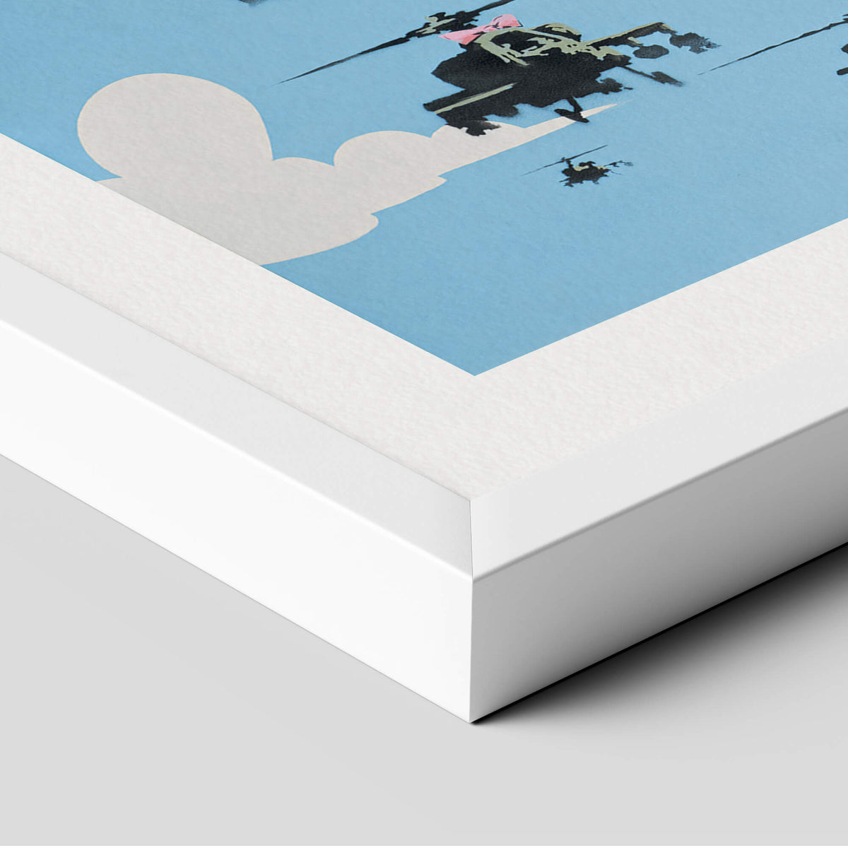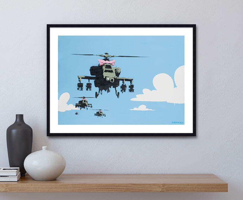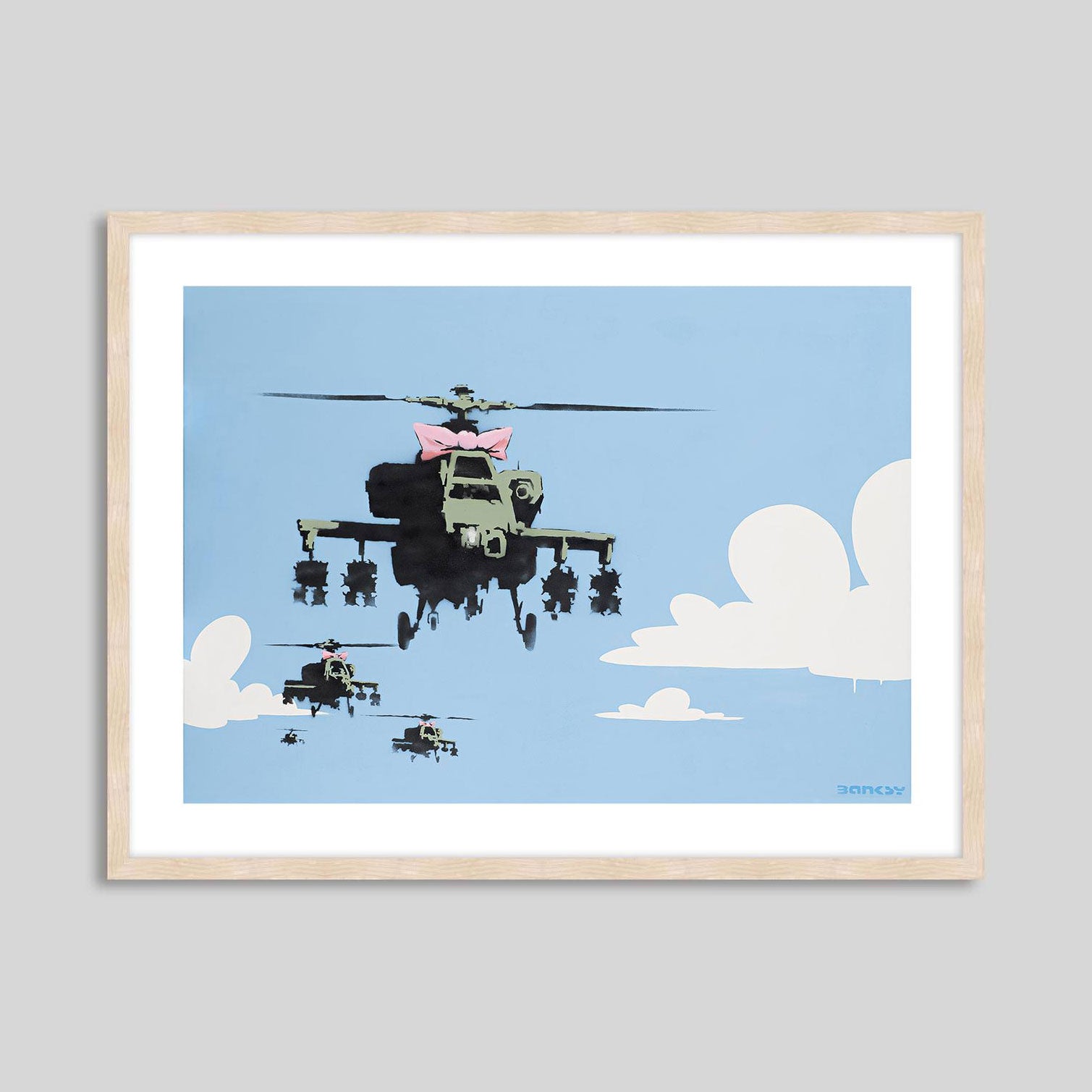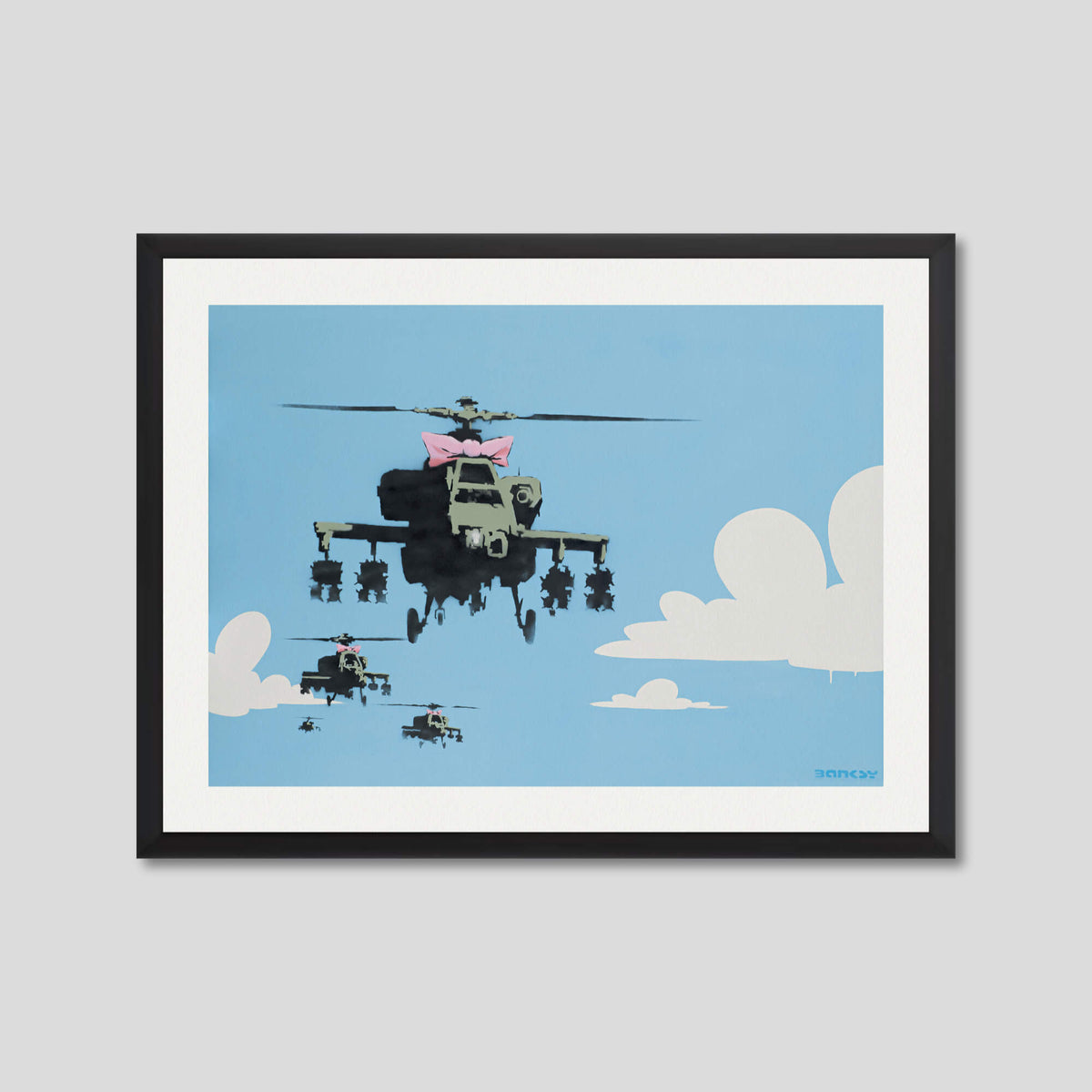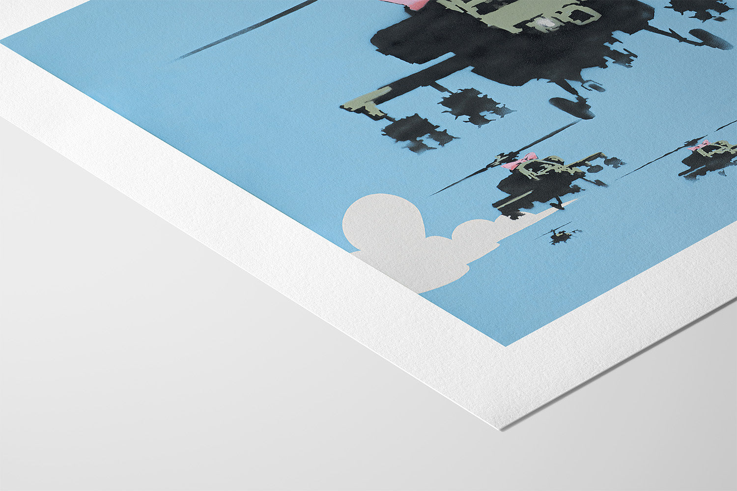 Happy Choppers depicts a squadron of armed military with a bright blue sky in the background. The sky, painted with white clouds, is quite simplistic and cartoon-like, almost reminiscent of The Simpsons opening credits. On the other hand, the helicopters are painted with more details insisting on their war equipment which accentuates the danger of the situation. The lead « chopper » (American slang for a helicopter which became popular during the Korean War) is dressed in a girly pink bow. The composition showcases an association of typically contradictory elements, that is to say the violence of warfare and the innocence of childhood. This premium quality giclee art print has been produced on luxurious 100% cotton rag textured art paper using archival quality inks resulting in a superior print suitable for museum or gallery display.