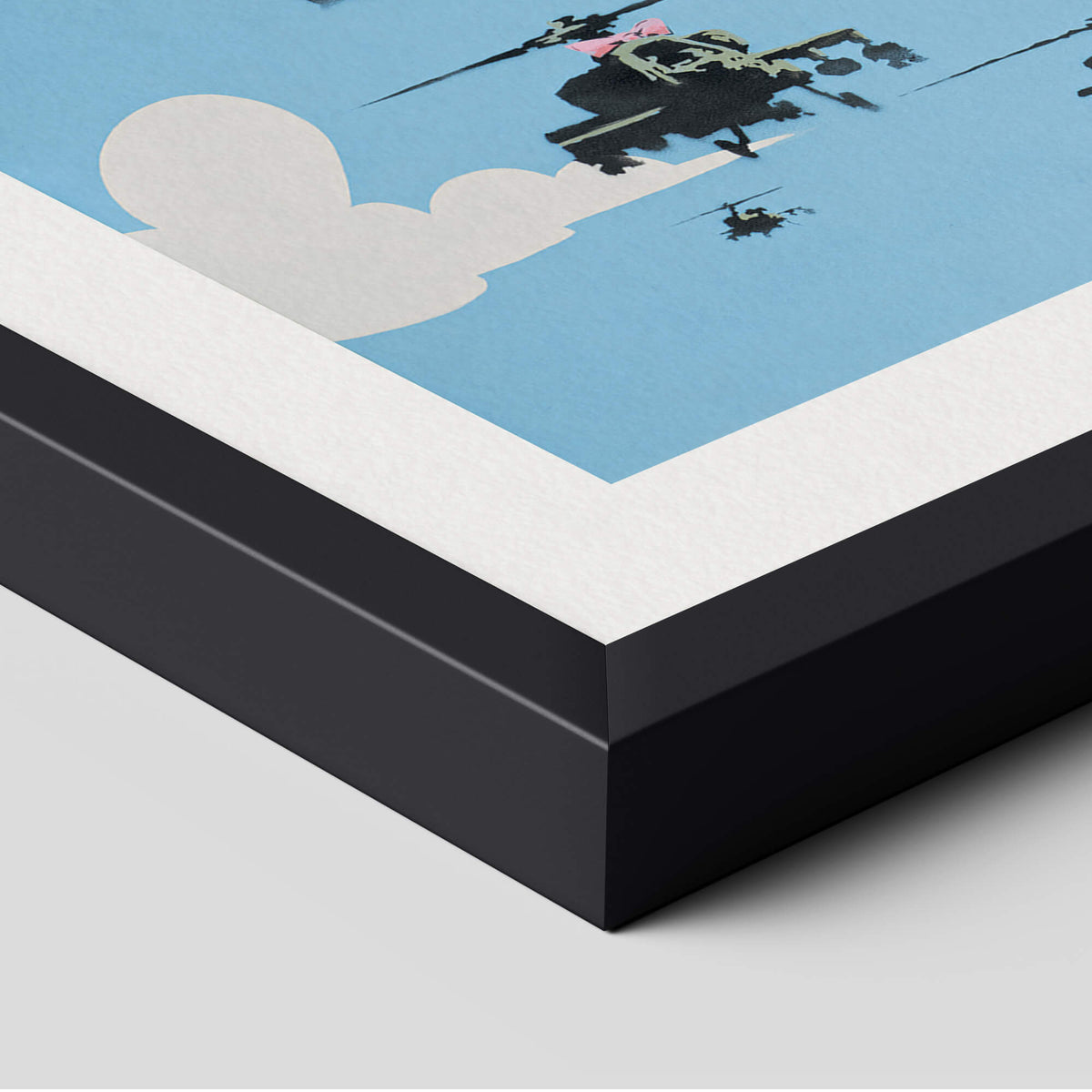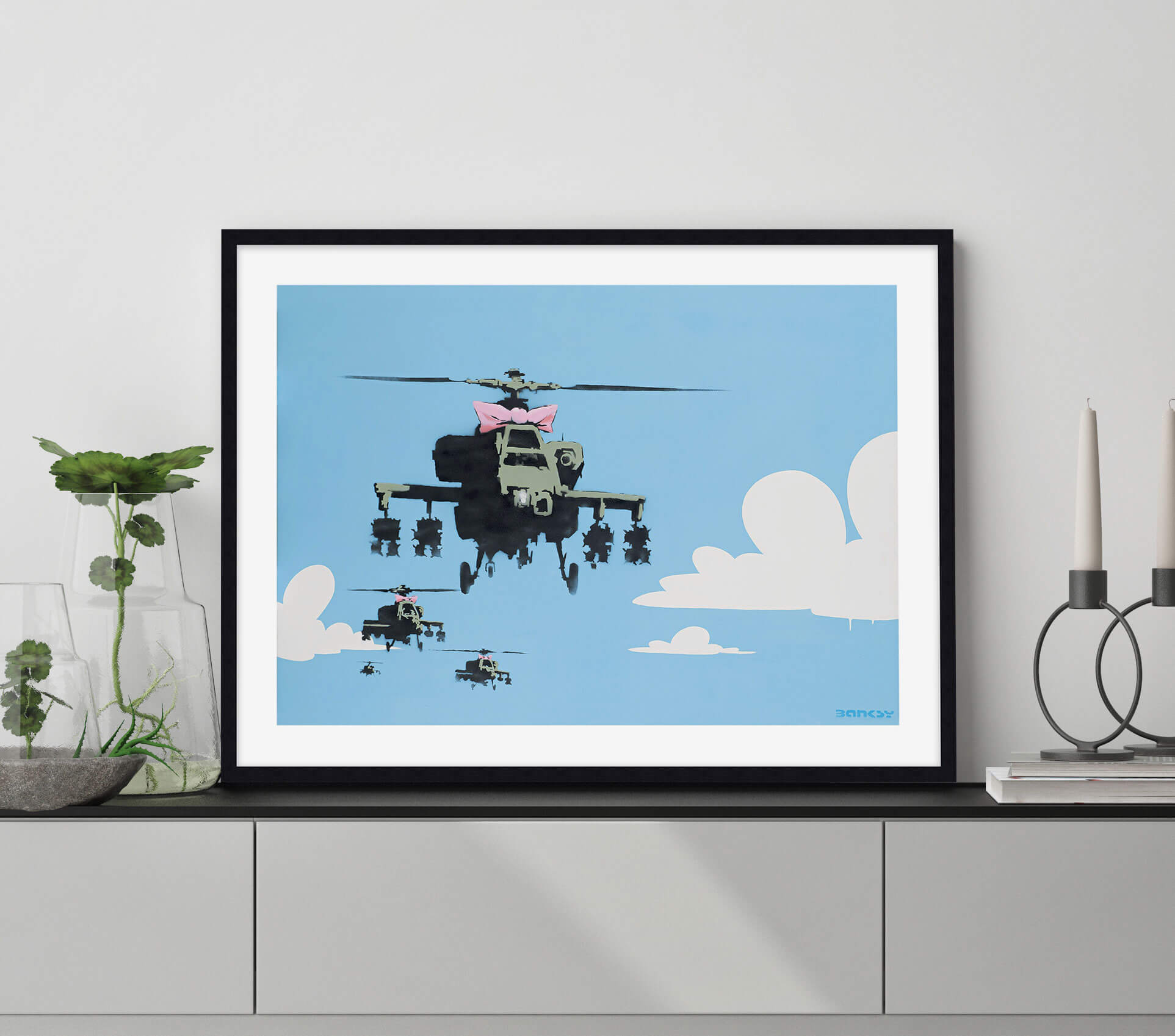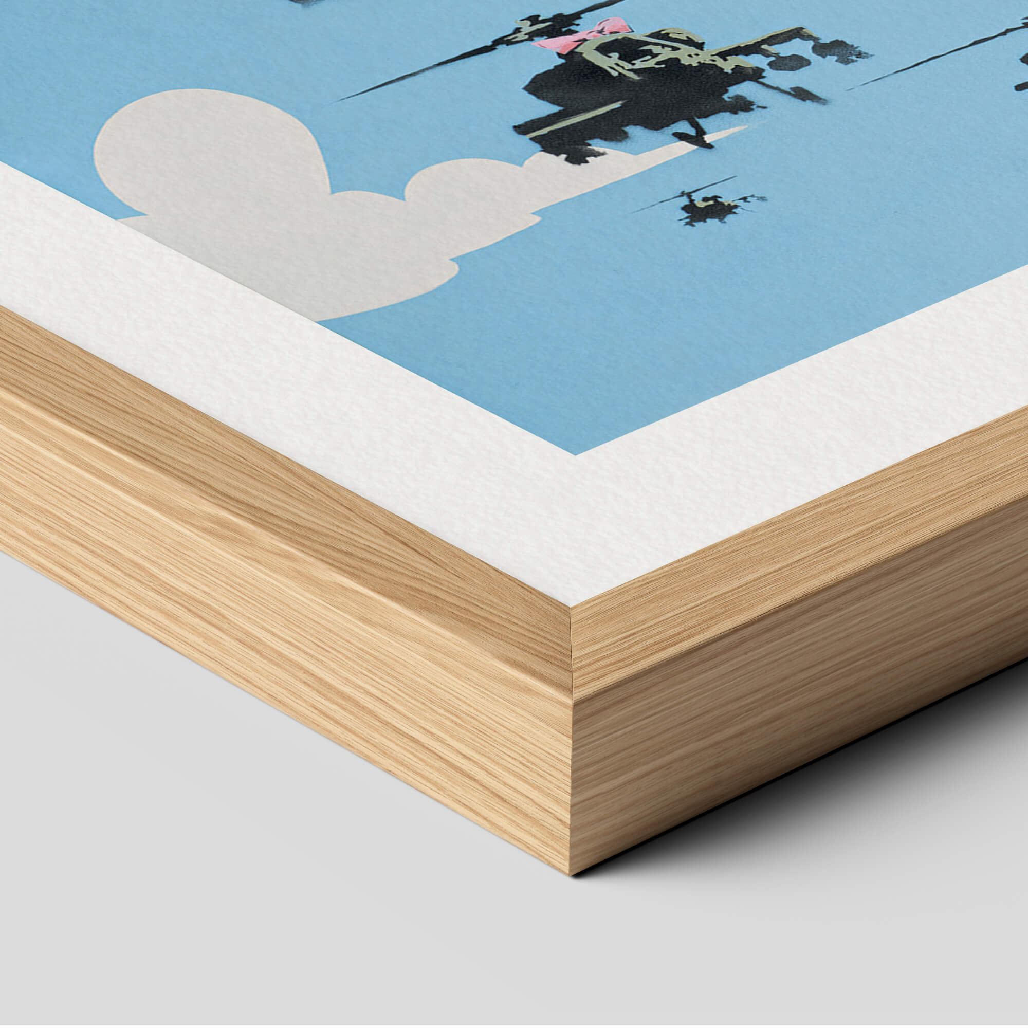 Happy Choppers depicts a squadron of armed military with a bright blue sky in the background. The sky, painted with white clouds, is quite simplistic and cartoon-like, almost reminiscent of The Simpsons opening credits. On the other hand, the helicopters are painted with more details insisting on their war equipment which accentuates the danger of the situation. The lead « chopper » (American slang for a helicopter which became popular during the Korean War) is dressed in a girly pink bow. The composition showcases an association of typically contradictory elements, that is to say the violence of warfare and the innocence of childhood. This premium quality giclee art print has been produced on luxurious 100% cotton rag textured art paper using archival quality inks resulting in a superior print suitable for museum or gallery display.