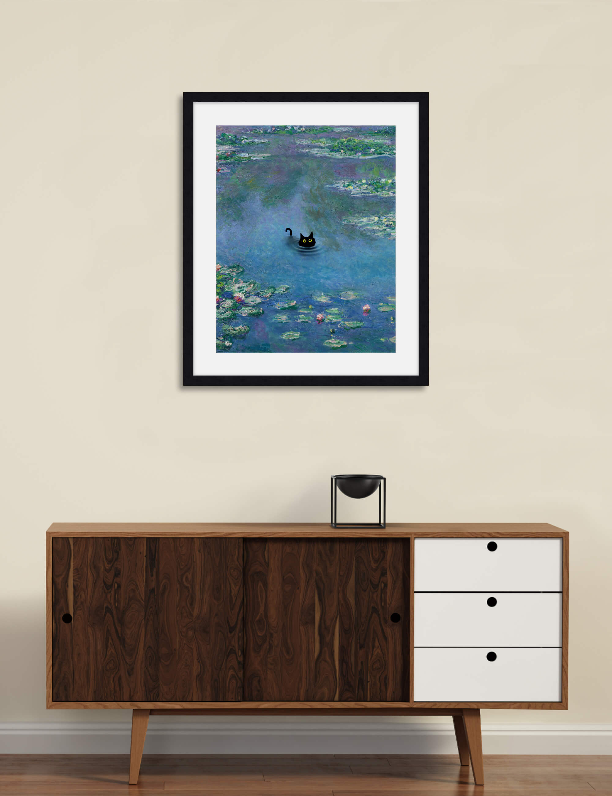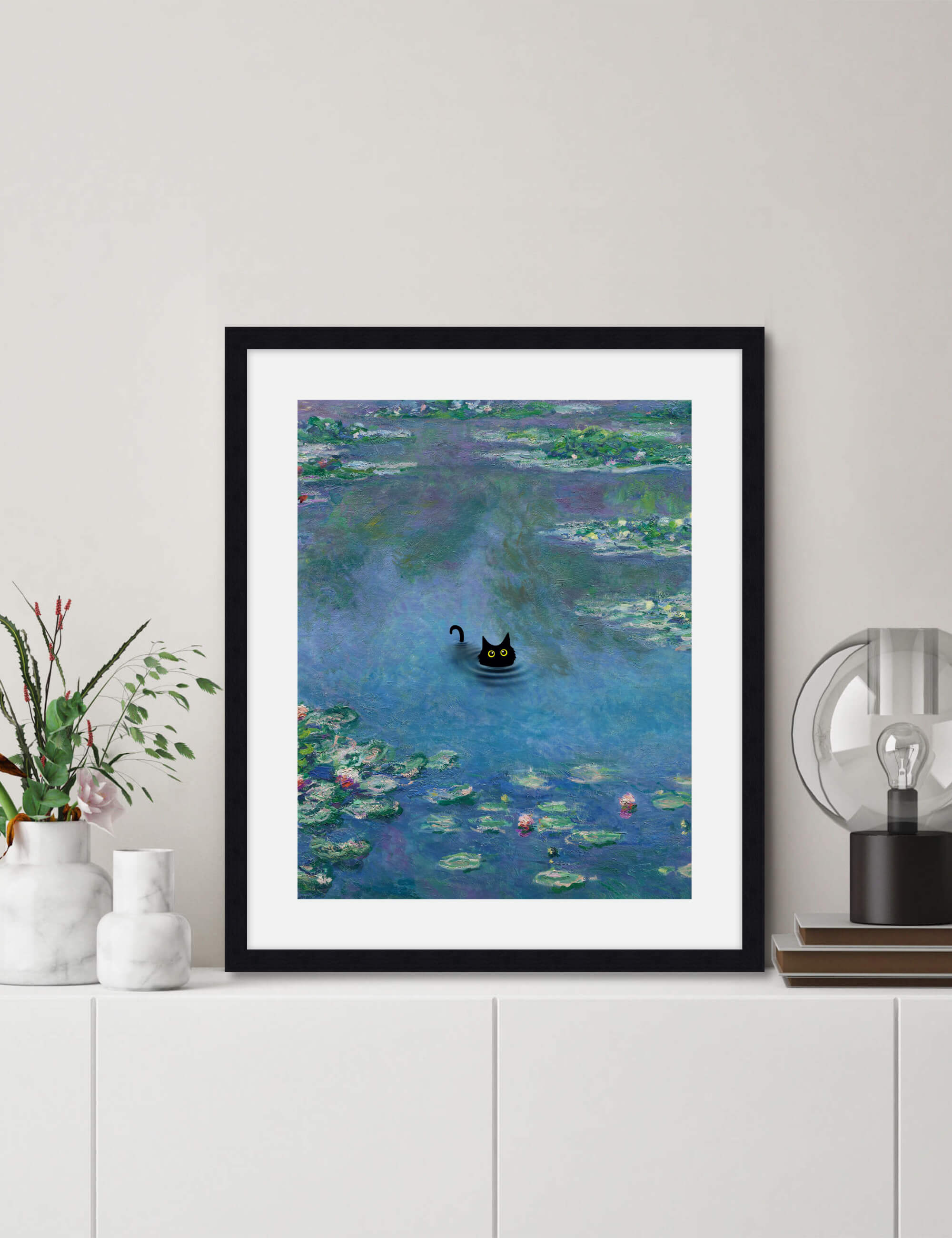 This playful and irreverent take on Claude Monet's iconic work The Water Lily Pond featuring the addition of a mischevious little black cat is perfect for adding a humorous light hearted tone to any setting. We love utilising it as a feature artwork in the bathroom or in a kids room. A delightful and fun artwork that is guaranteed to make you smile.