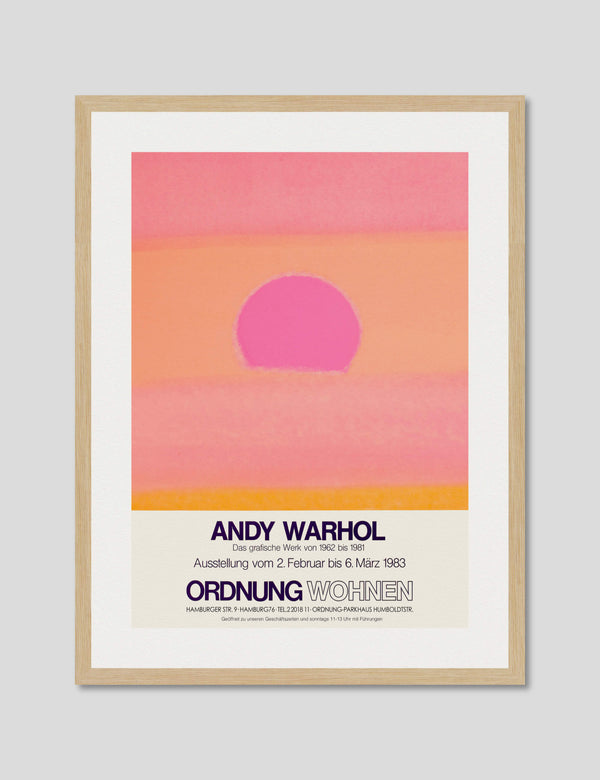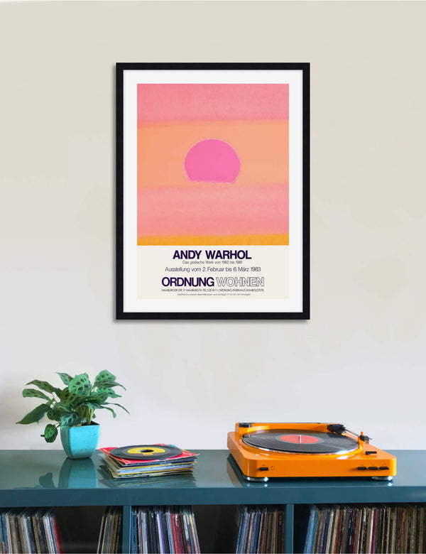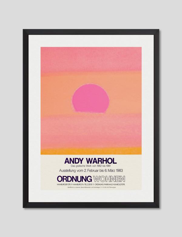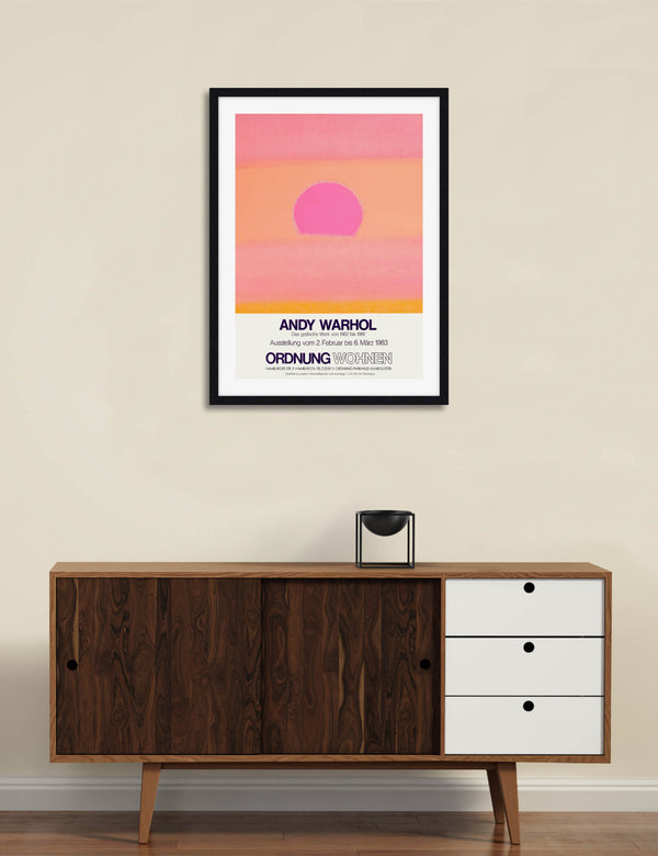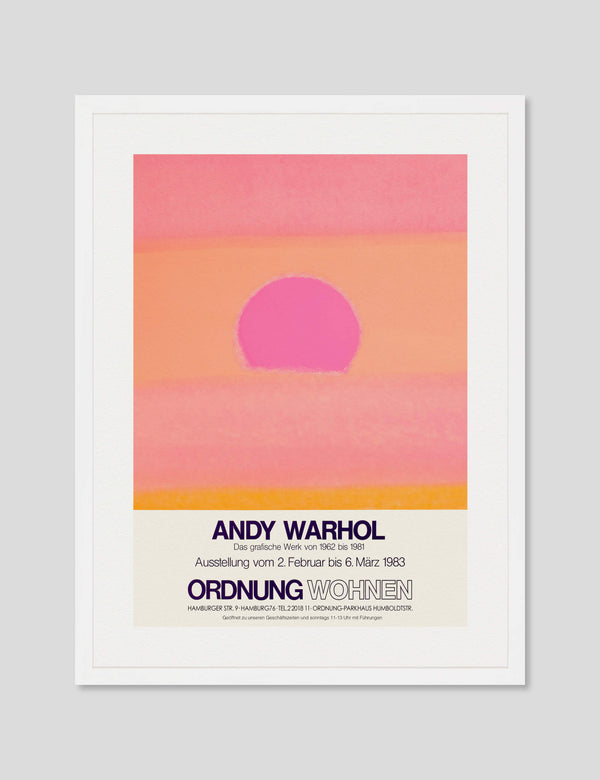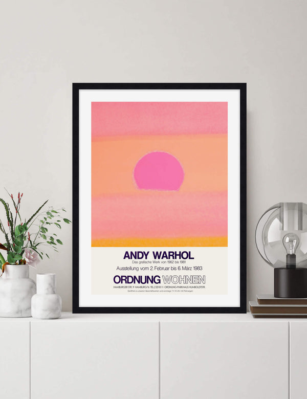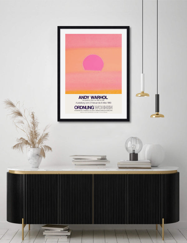 This gallery quality giclee art print reproduction of the original promotional poster for Andy Warhol's 1983 exhibition Ordnung Wohnen held in Hamburg, Germany features our favourite Warhol Sunset variant. This captivating artwork has been produced on luxurious heavyweight textured art paper using archival inks that won't fade over time resulting in a superior print with pin-sharp detail, rich vivid colours and unparalleled durability.