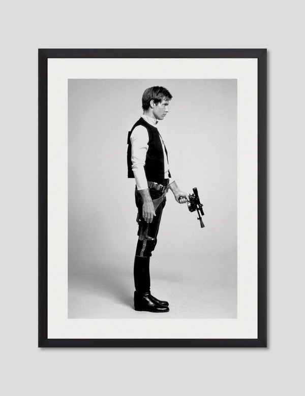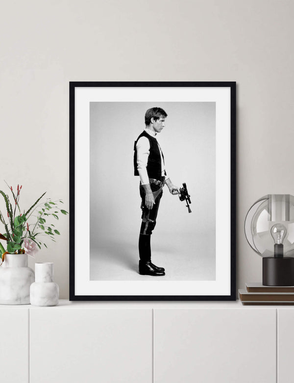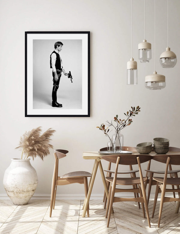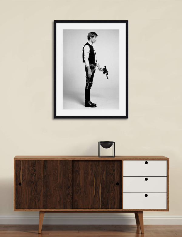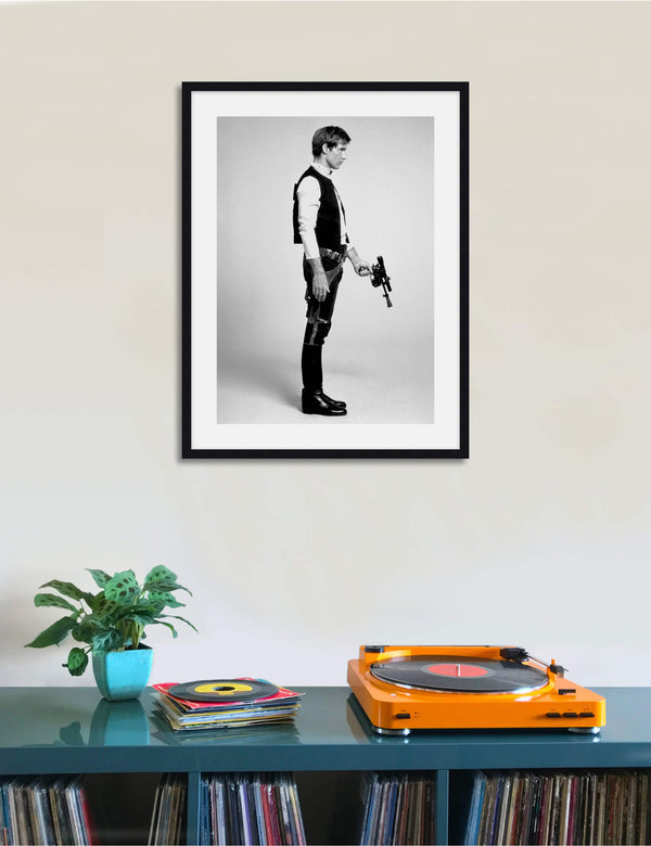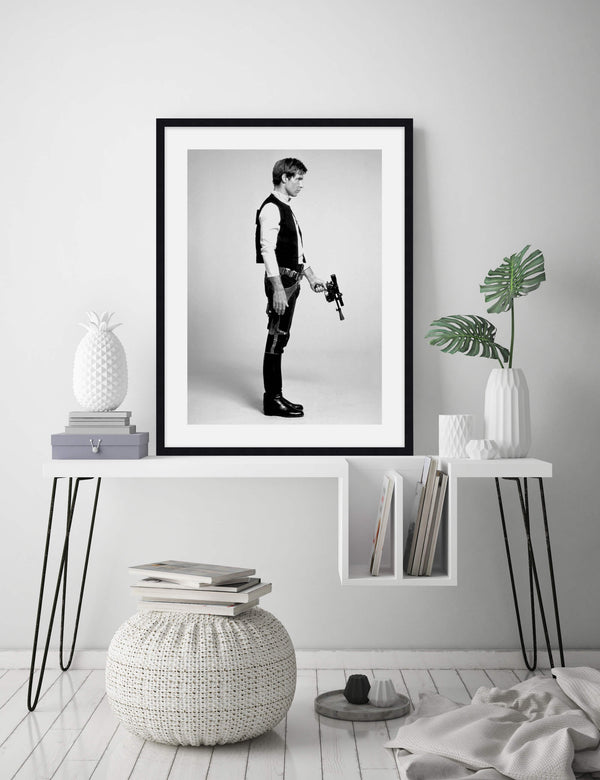 This stylish vintage black & white photograph of Han Solo played by Harrison Ford is the perfect gift for any Star Wars fan - young or old. A great choice for a boys room or the man cave!