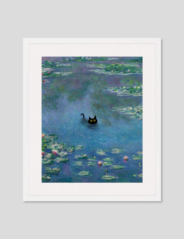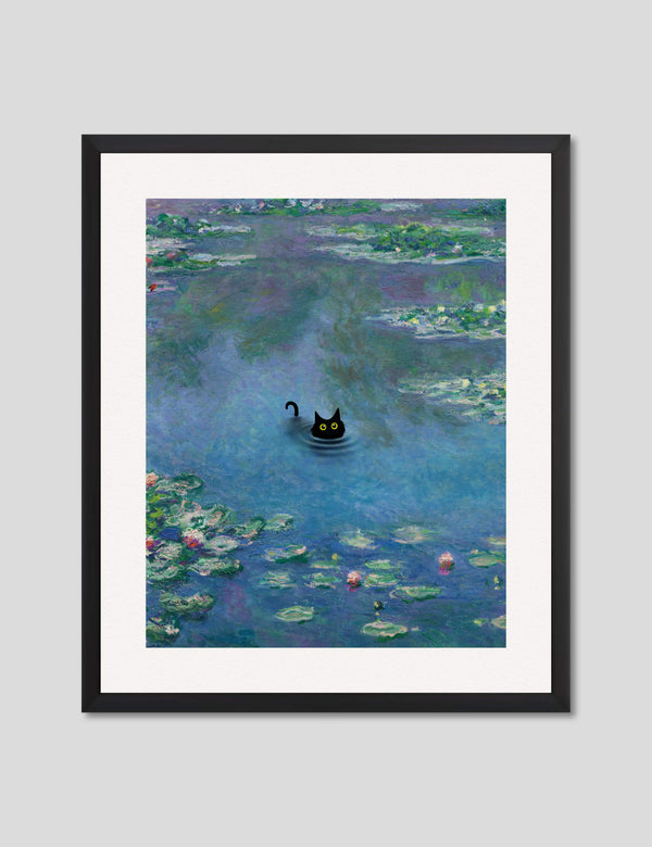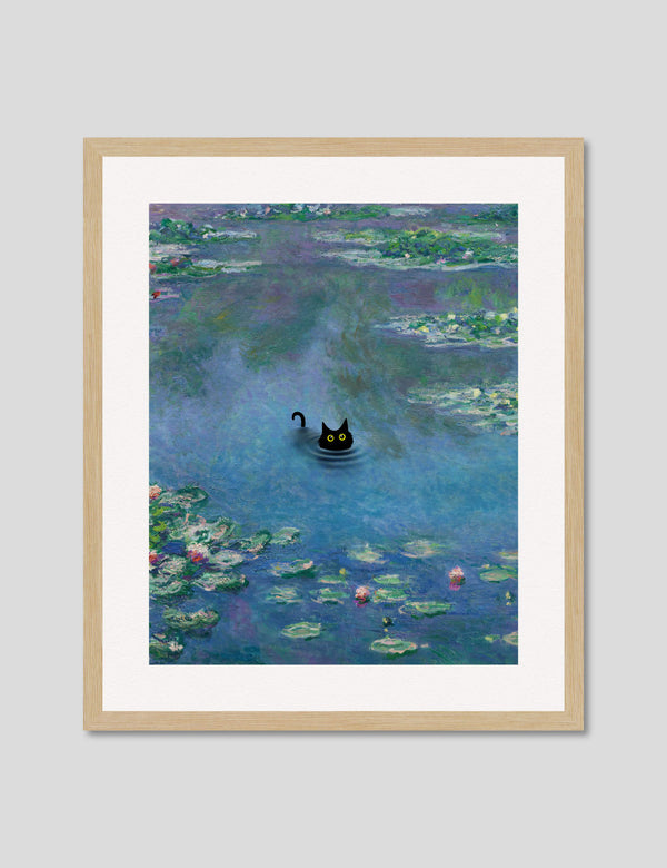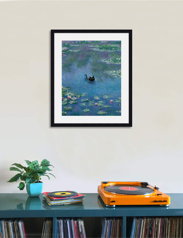 This playful and irreverent take on Claude Monet's iconic work The Water Lily Pond featuring the addition of a mischevious little black cat is perfect for adding a humorous light hearted tone to any setting. We love utilising it as a feature artwork in the bathroom or in a kids room. A delightful and fun artwork that is guaranteed to make you smile.