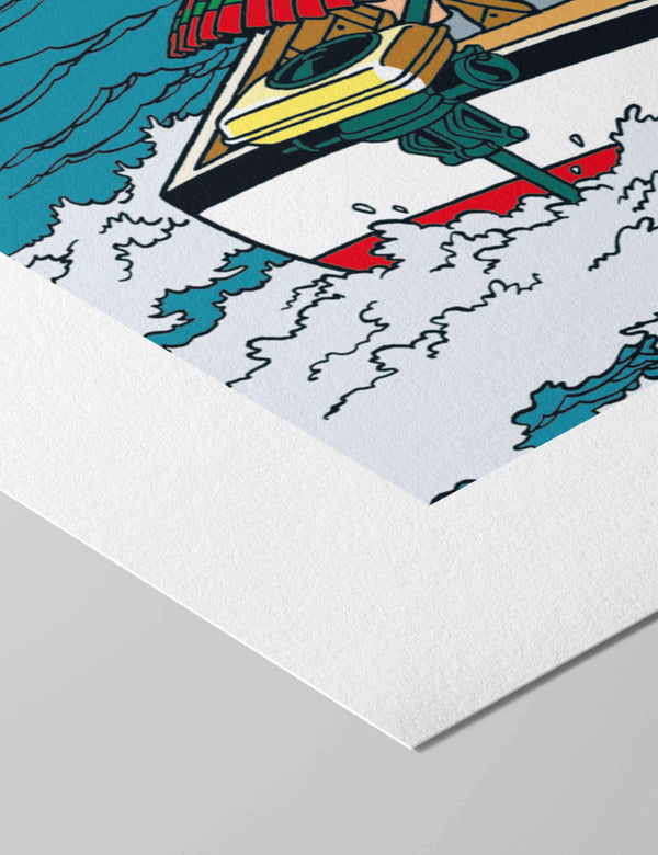 L'ile Noire, first published in 1938, is the seventh instalment of The Adventures of Tintin, a series of classic comic-strip albums, written and illustrated by Belgian writer and illustrator Hergé, featuring the young reporter Tintin as the hero. This premium quality giclee art print has been produced on luxurious 100% cotton rag textured art paper using archival quality inks resulting in a superior print suitable for museum or gallery display.
