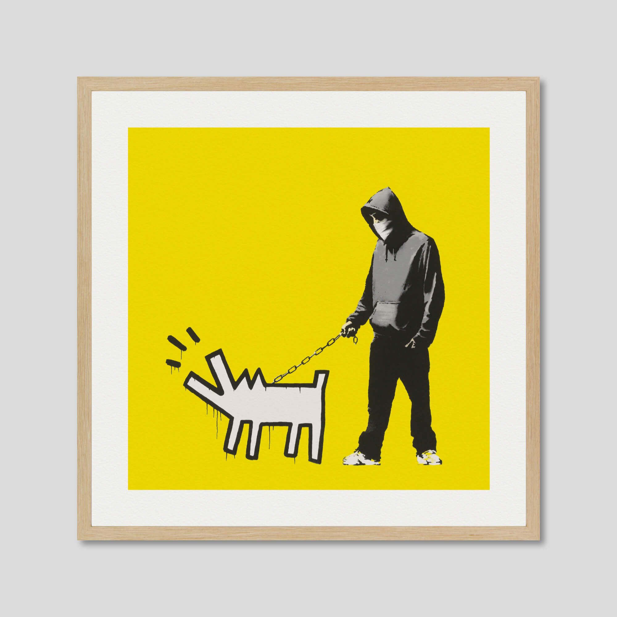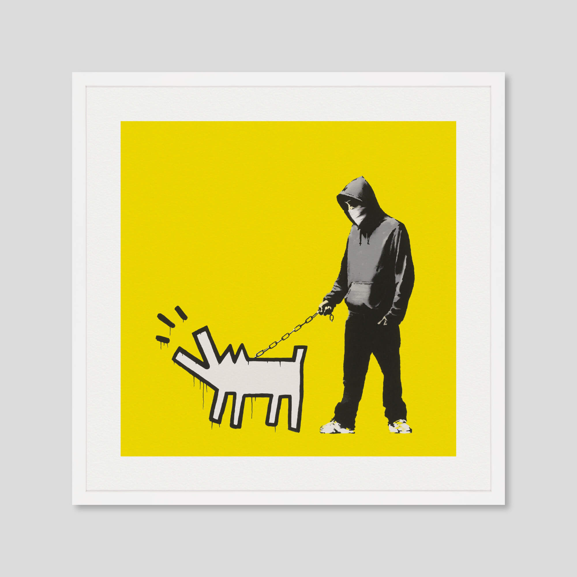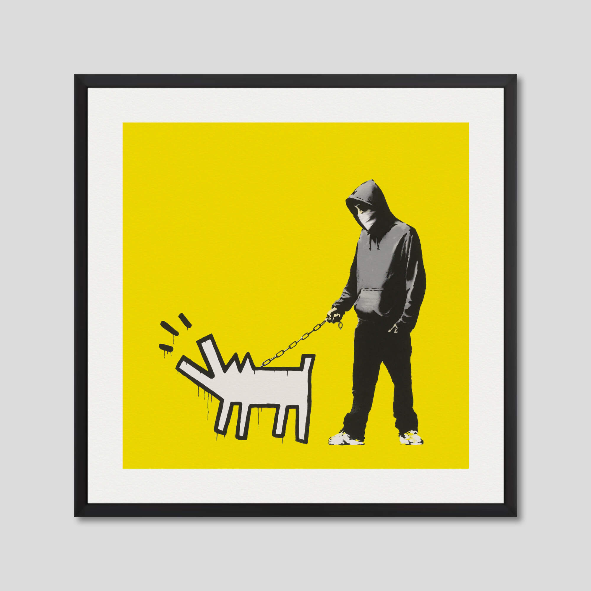 The artwork Choose Your Weapon by Banksy first appeared on a wall in The Grange, Camberwell Southwark district of South London in 2010. The stencil depicts a hooded man with dark clothing and a bandanna hiding his face, a figure recurrent in Banksy’s stencils. His menacing appearance is contrasted by his casual hand-in-the-pocket posture as well as his dog. The dog, which is represented chained and barking, thus becomes the young man’s weapon, rather than a firearm or a knife. The minimalist animal, painted in a graphic style and in an all white silhouette, creates a contraction with the hyper-realistic representation of the master. The dog pays tribute to the famous “Barking Dog” by American artist Keith Haring. Choose Your Weapon evokes the British disaffected youth and gangs who often have aggressive dogs. But in a world Banksy believes to be abusive, he invites us to choose our weapon for peace and freedom. This premium quality giclee art print has been produced on luxurious 100% cotton rag textured art paper using archival quality inks resulting in a superior print suitable for museum or gallery display.